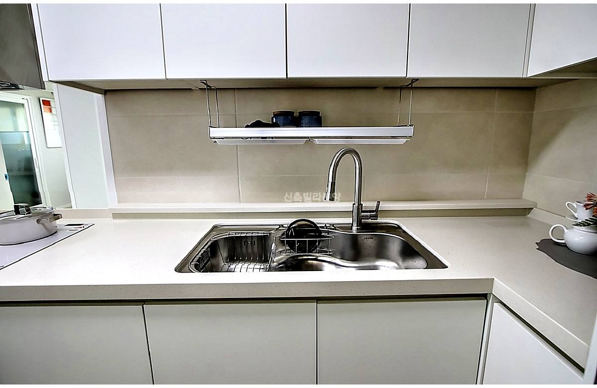 수유동신축빌라 해바라기 수전에 수납장과 다용도 선반이 기본 구성으로 들어가 있고,