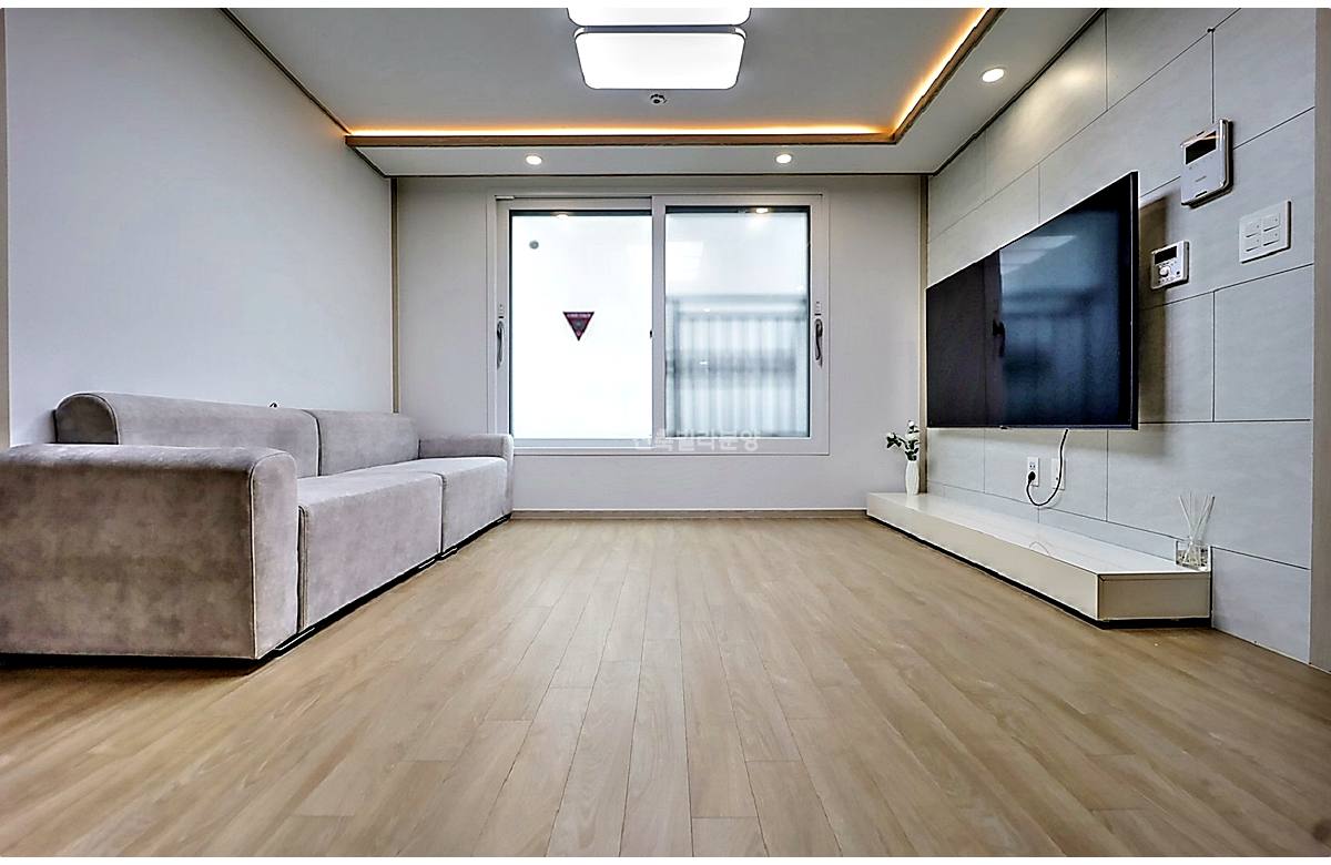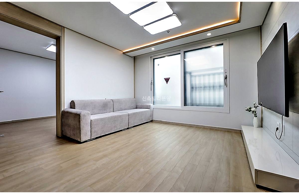 군포신축빌라 내부는 질리지 않는 모던 인테리어로 꾸며져 있습니다. 거실은 대로변을 마주하고 있어 막힘없는 개방감을 선사하며, 넉넉한 아트월 거리는 대형 TV를 설치해도 시야가 편안합니다. 천장의 라인 조명과 LED 등은 집안 분위기를 한층 아늑하게 만들어주네요.