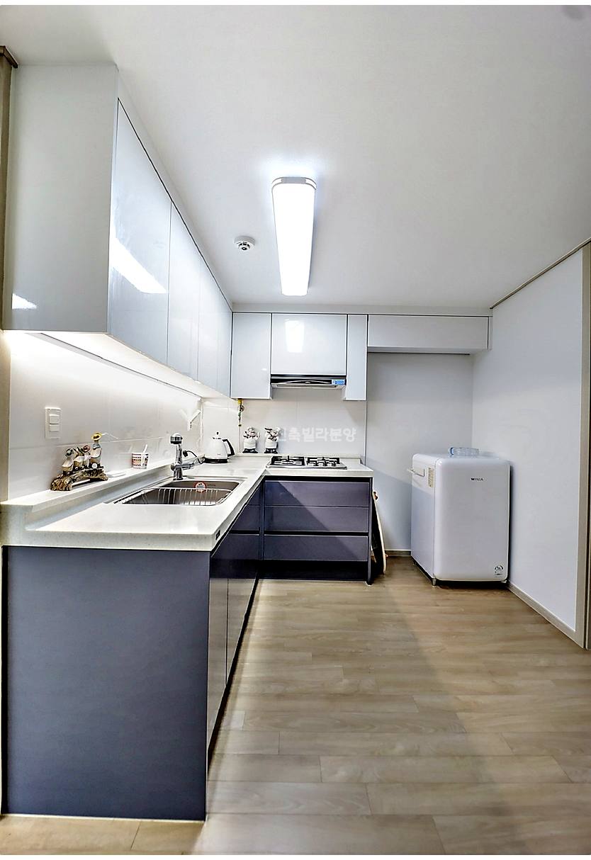 주방은 거실과 분리된 ㄱ자형 구조로 동선 효율을 극대화했습니다. 양문형 냉장고 자리가 넉넉히 확보되어 있으며, 아일랜드 식탁을 활용해 조리 공간과 식사 공간을 유연하게 사용할 수 있습니다. 특히 3개의 방은 모두 가구 배치가 용이한 반듯한 구조로 설계되어, 식구가 많은 가정에서도 각자의 독립된 공간을 충분히 누릴 수 있습니다.