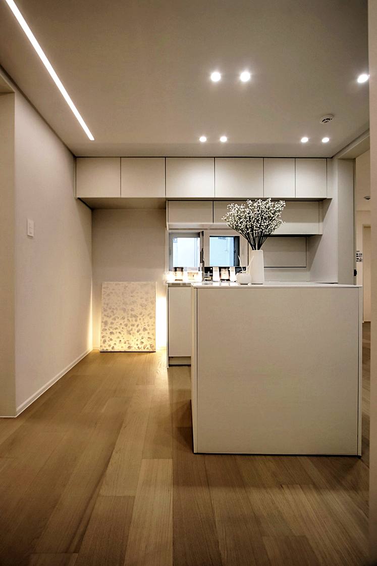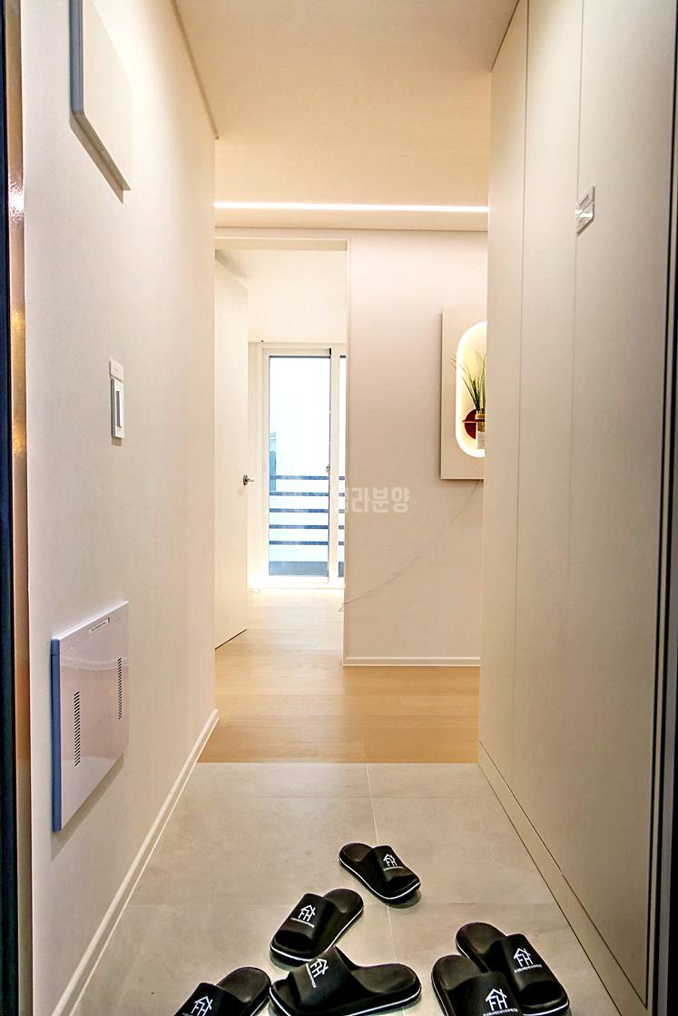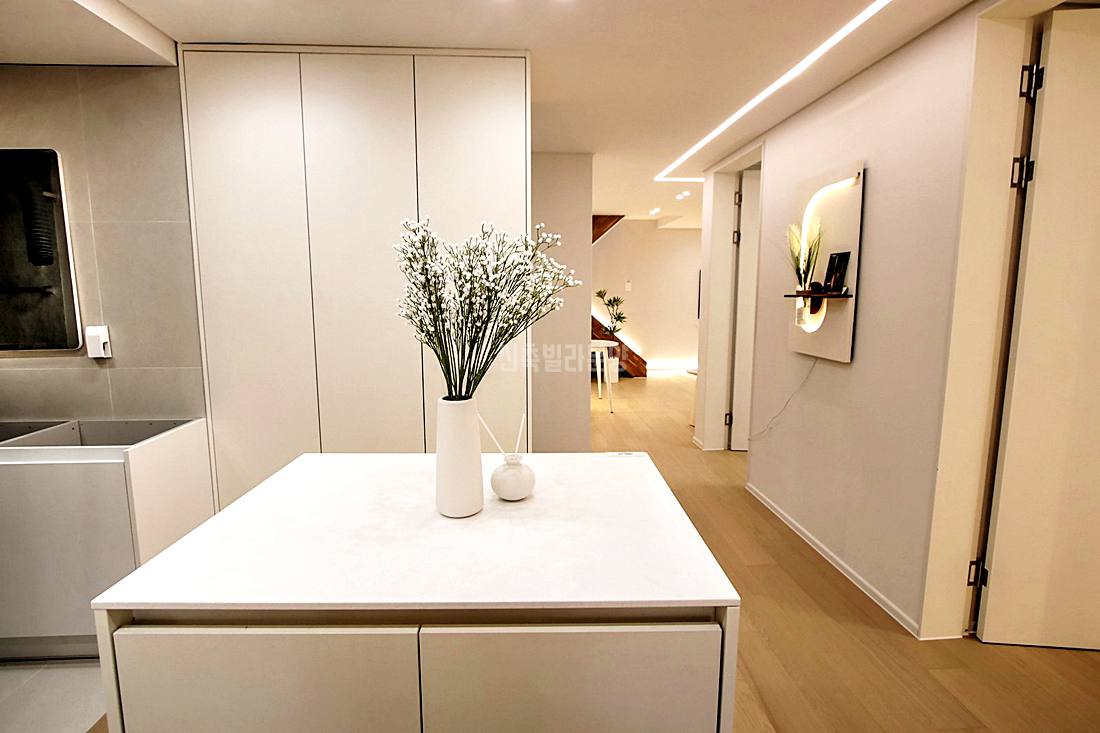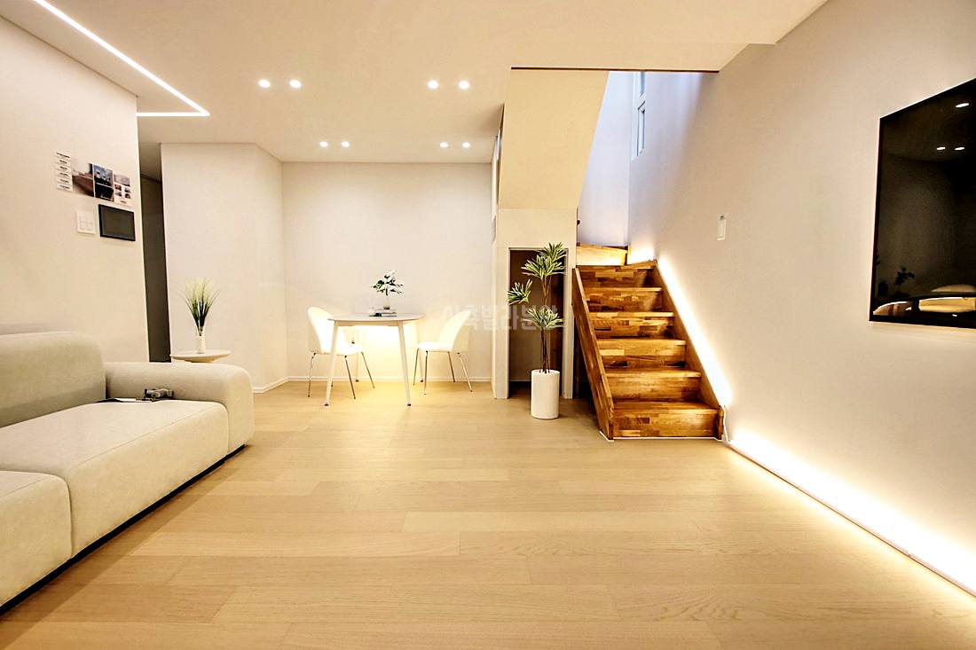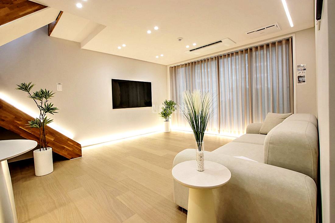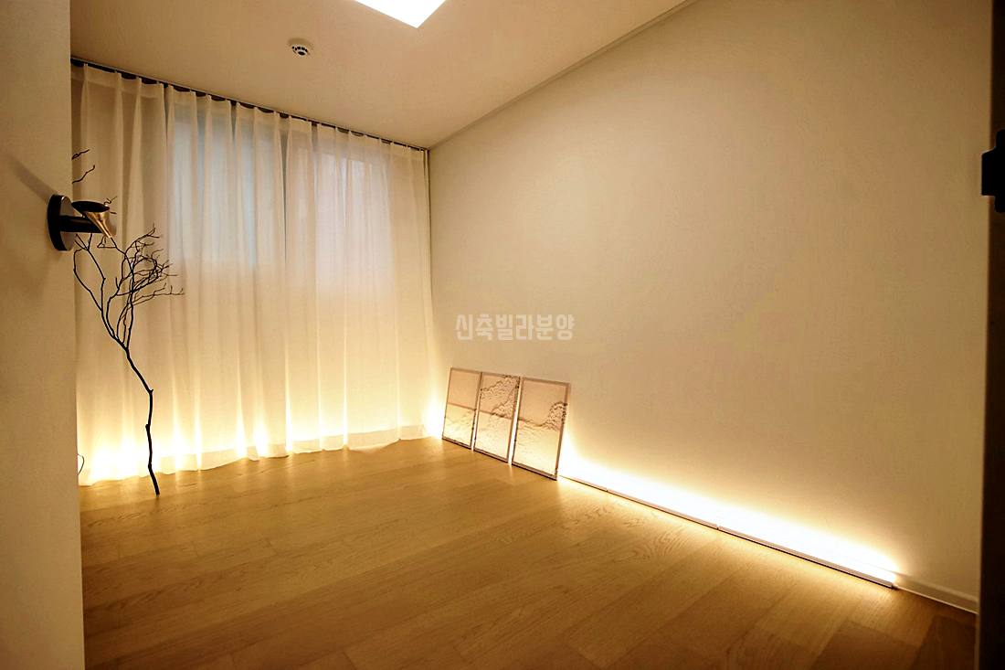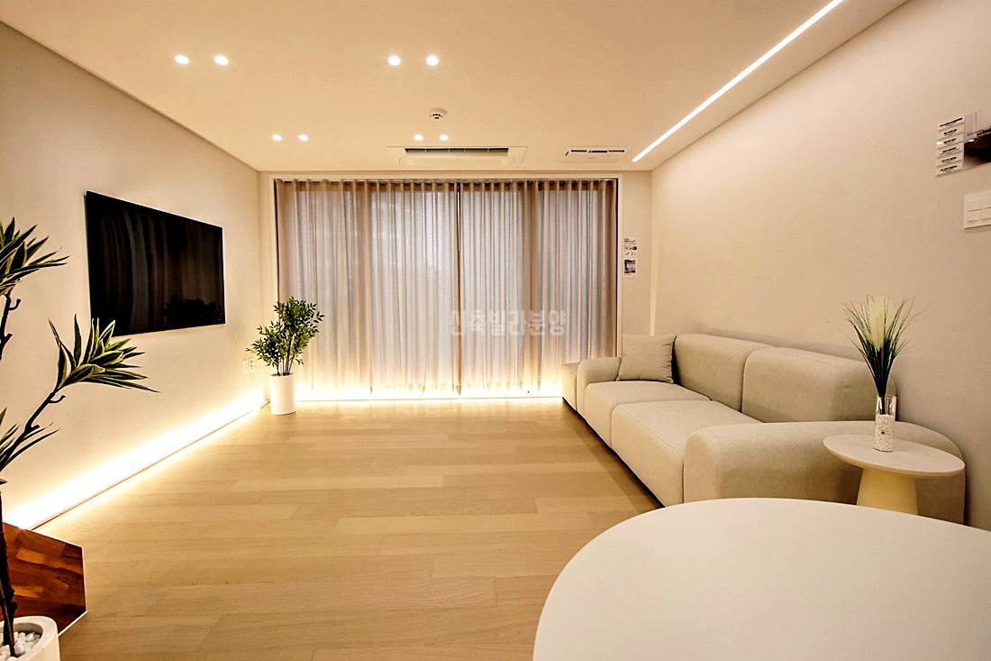 갈산동신축빌라 내부로 들어서면 가장 먼저 시원하게 뻗은 3BAY 판상형 구조가 눈에 들어옵니다. 화이트톤으로 정갈하게 마감된 인테리어는 심리적 안정감을 주며, 거실 천장에 매립된 시스템 에어컨은 사계절 내내 쾌적한 실내 온도를 유지해 줍니다. 특히 조명을 매립형으로 설계하여 시각적인 돌출 없이 깔끔한 천장 라인을 완성한 점이 인상적입니다.