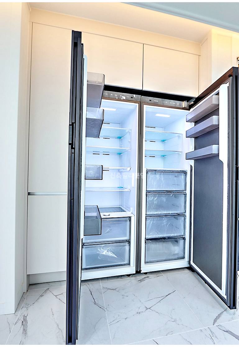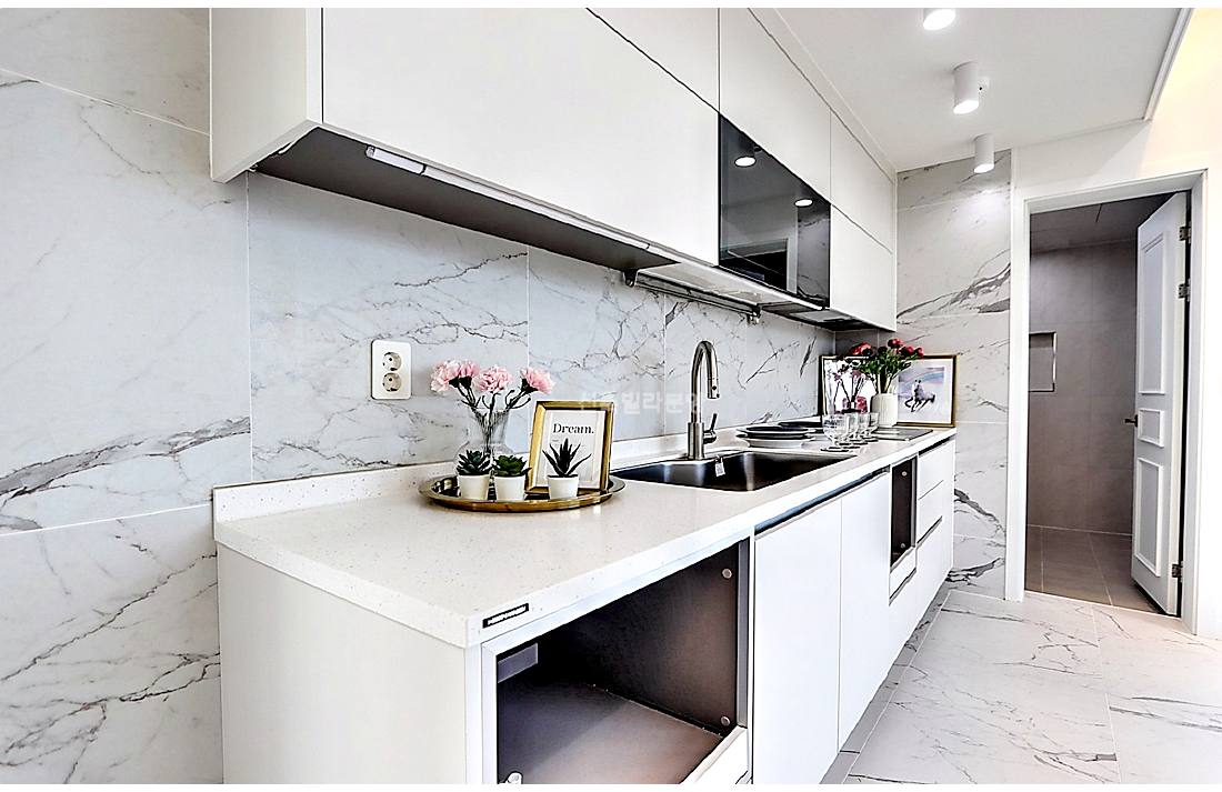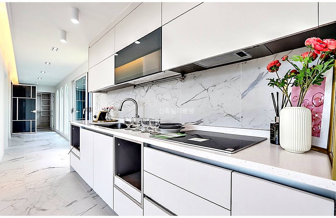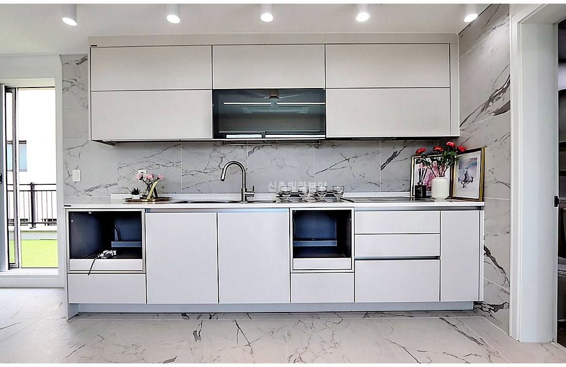 ㄱ자 동선에 세탁기와 냉장고가 모두 매립되어 있습니다.