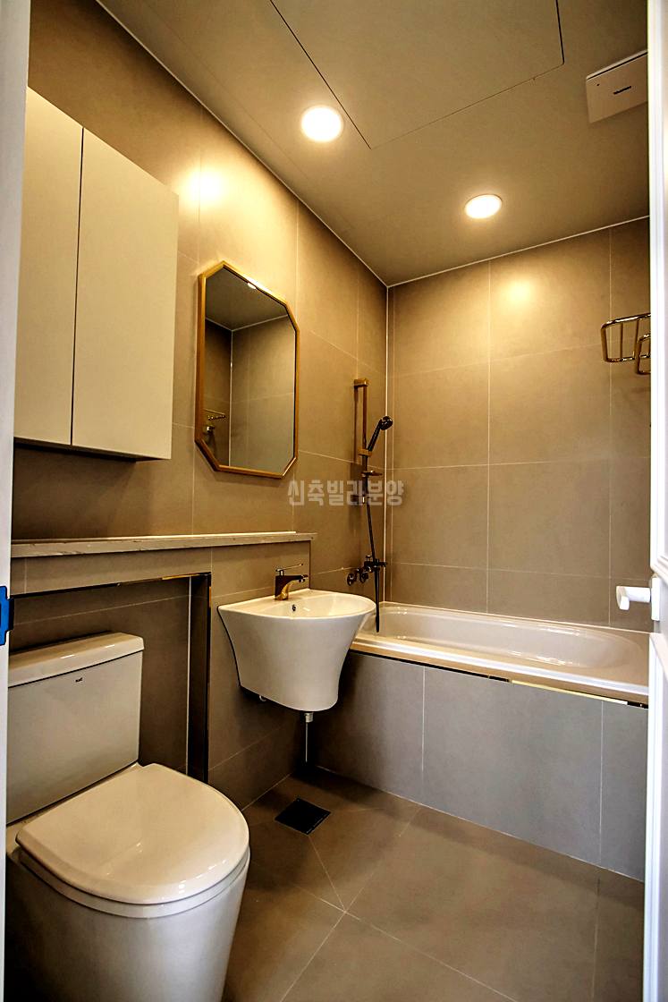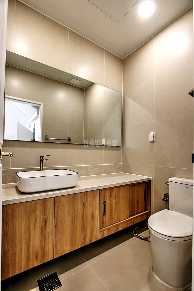 파주신축빌라 1층 욕실은 샤워 기능보다는 손님용 화장실 개념으로 간단하게 구성되어 있습니다. 하부장 세면대로 최소 구성이지만, 오히려 이것이 공간 낭비를 줄이는 효율적 설계로 평가됩니다.