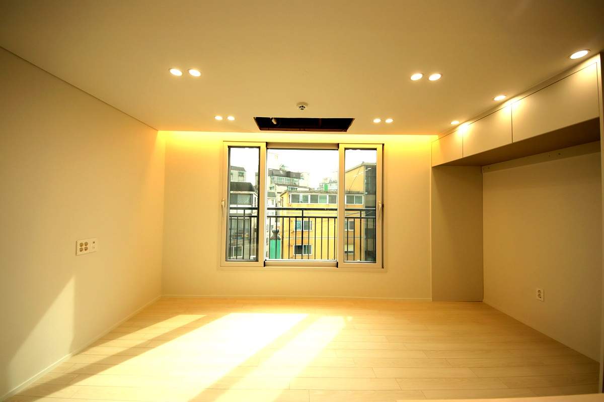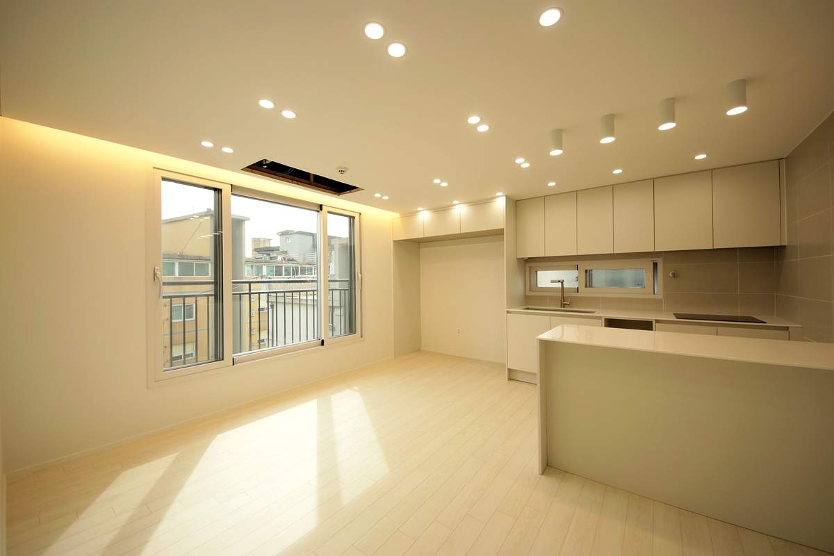 탑동신축빌라 문을 열고 들어서면 가장 먼저 반겨주는 것은 햇살 가득한 거실입니다. 주방과 일체형으로 설계되어 실제 평수보다 훨씬 더 넓어 보이는 개방감을 선사하죠. 천장에는 시스템 에어컨 자리가 미리 확보되어 있어 입주 시 깔끔한 인테리어 유지가 가능합니다. 특히 코너 땅에 위치한 덕분에 막힘없는 채광을 확보했다는 점이 이 집의 큰 장점이에요.