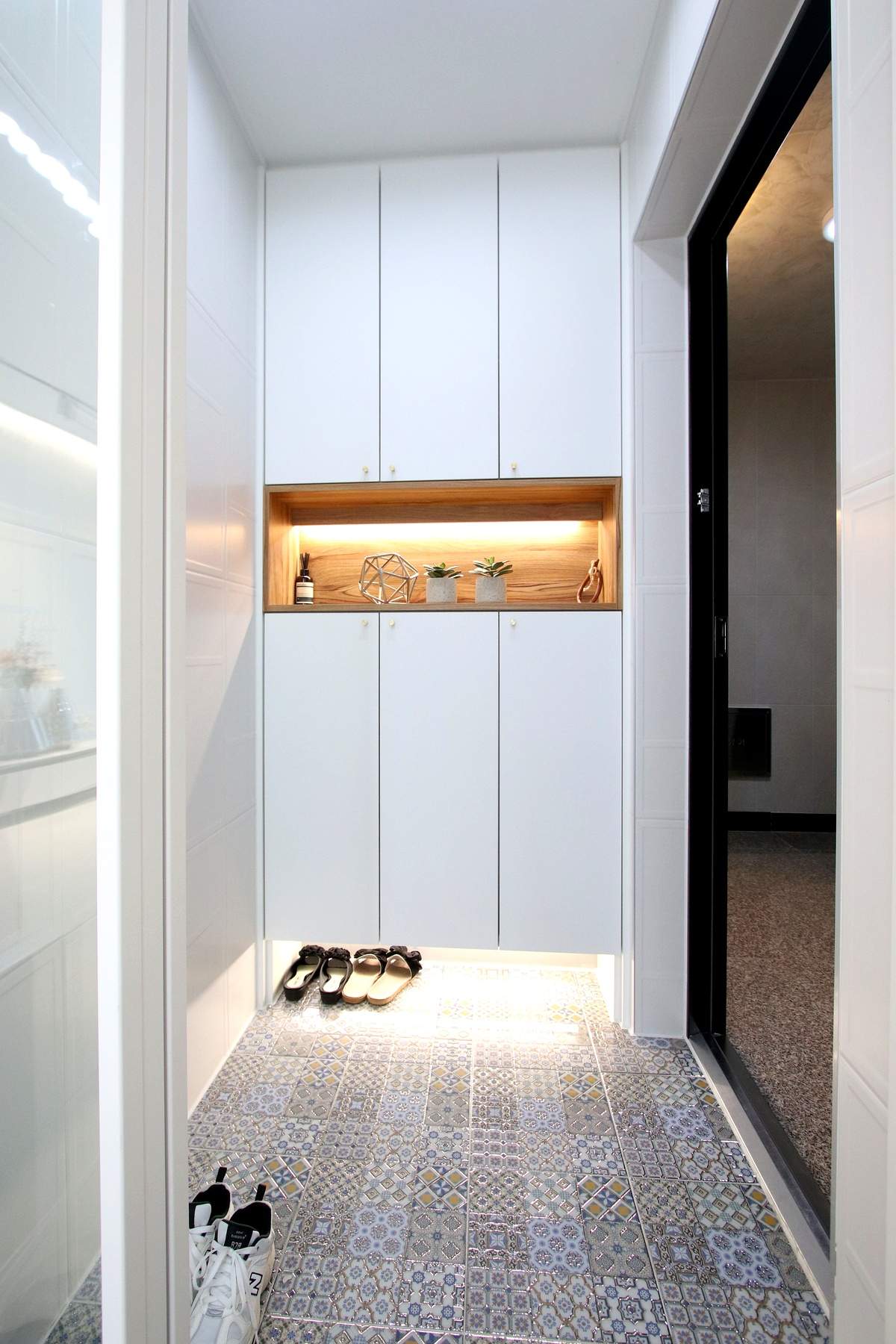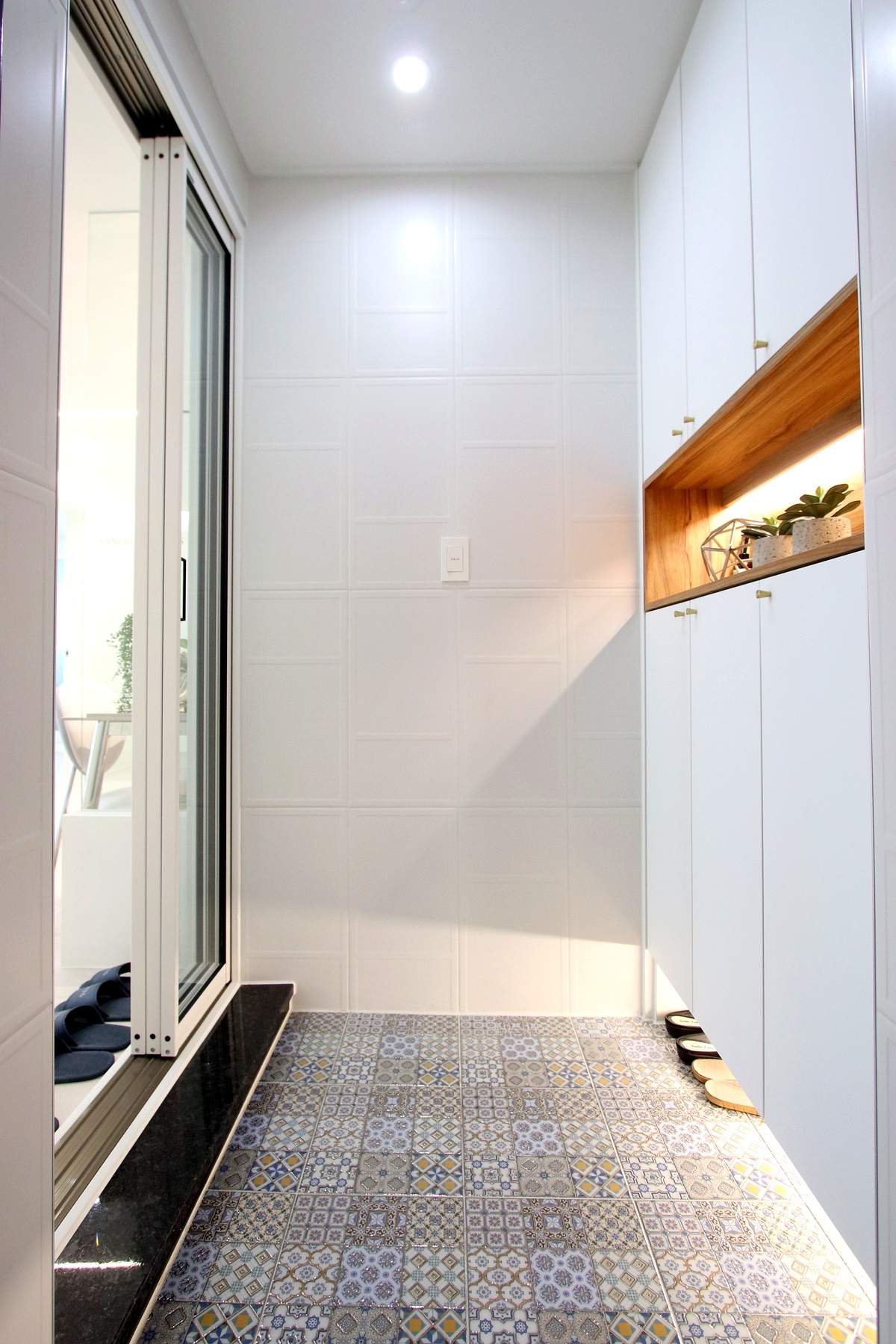 일동신축빌라 전실 전체가 화이트 톤으로 마감되어 있어서 집 안 분위기와 자연스럽게 이어져요.