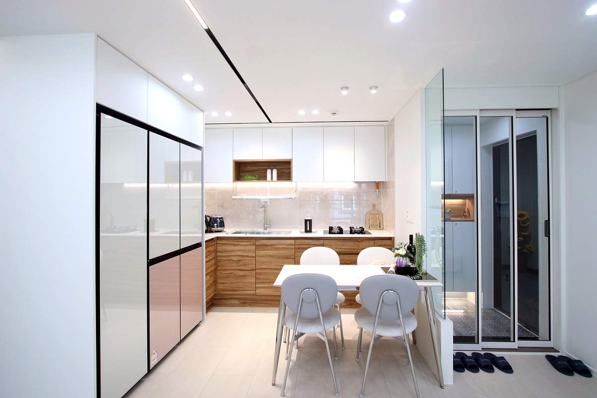ㄱ자 구조라 동선이 자연스럽고, 왼쪽 끝에 냉장고 자리가 따로 확보돼 있어요.