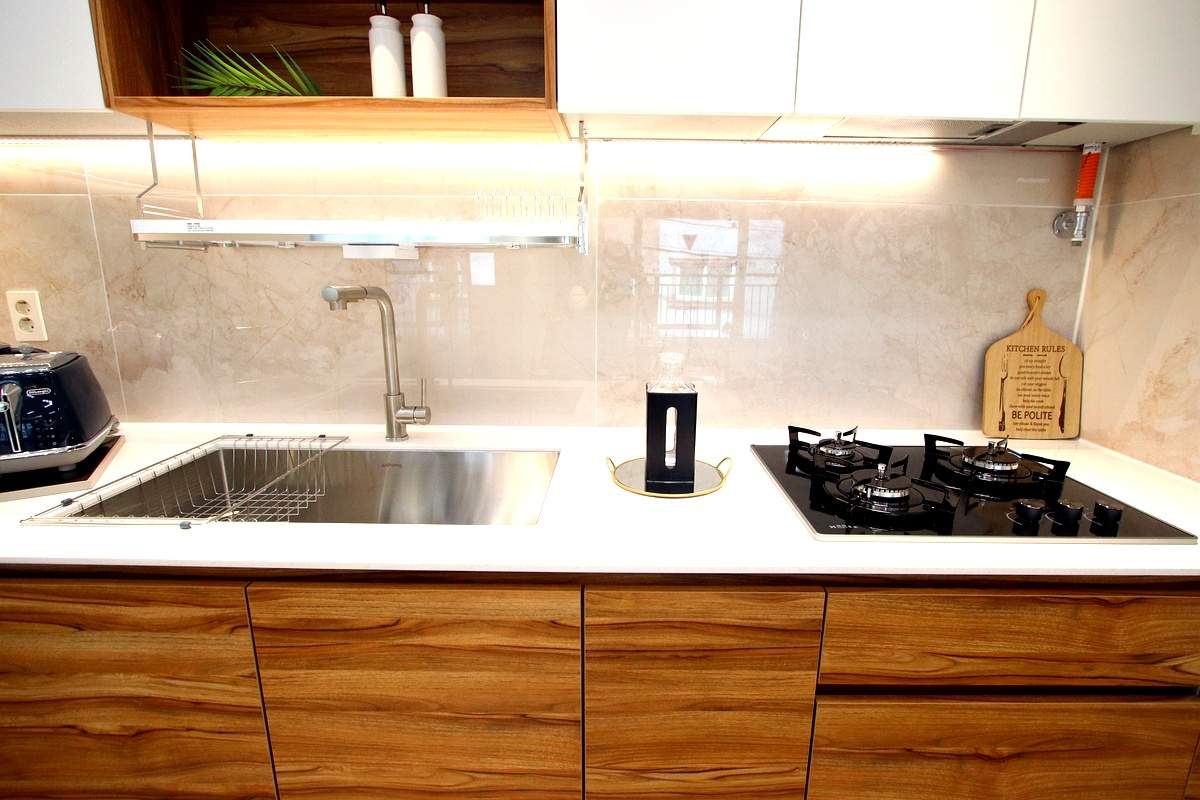 따뜻한 우드 색감의 하부장과 화이트 상부장이 묘하게 잘 어울리는 조합이에요.