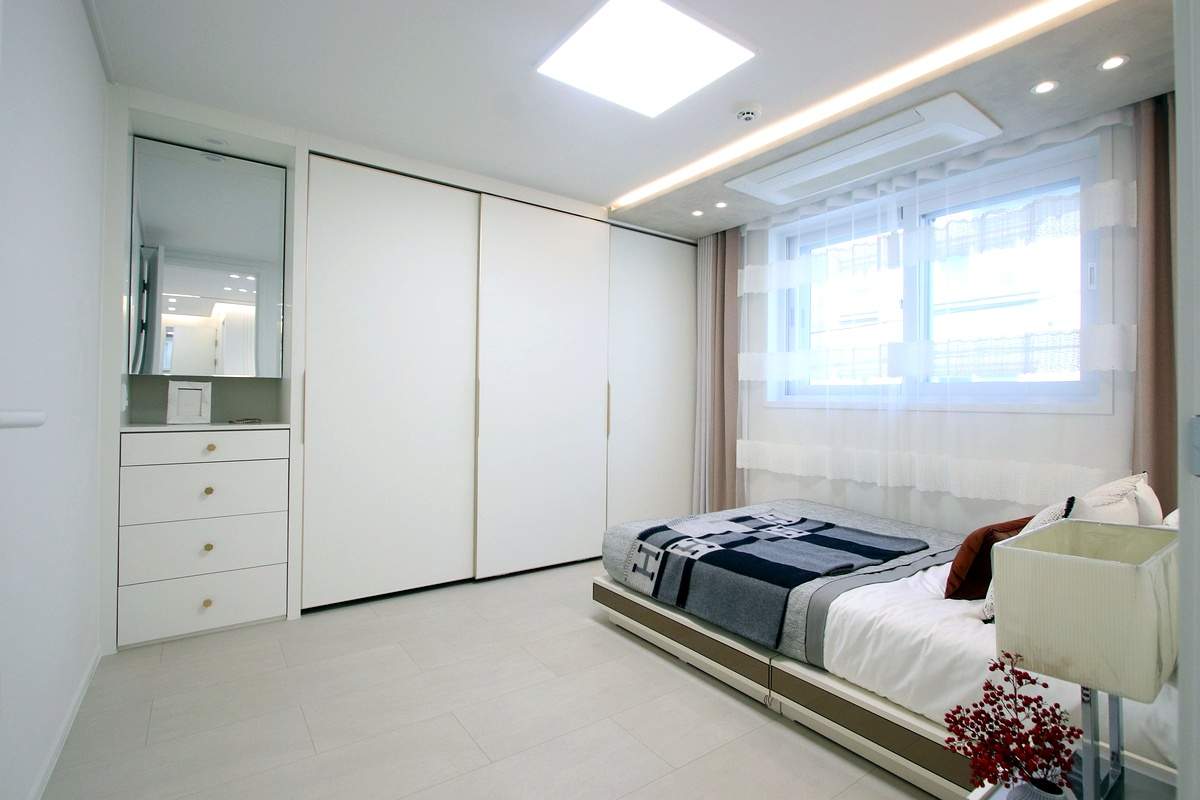 안산신축빌라 안방에는 붙박이장이 시공되어 있고, 옆으로 화장대 공간도 따로 구성되어 있어요.