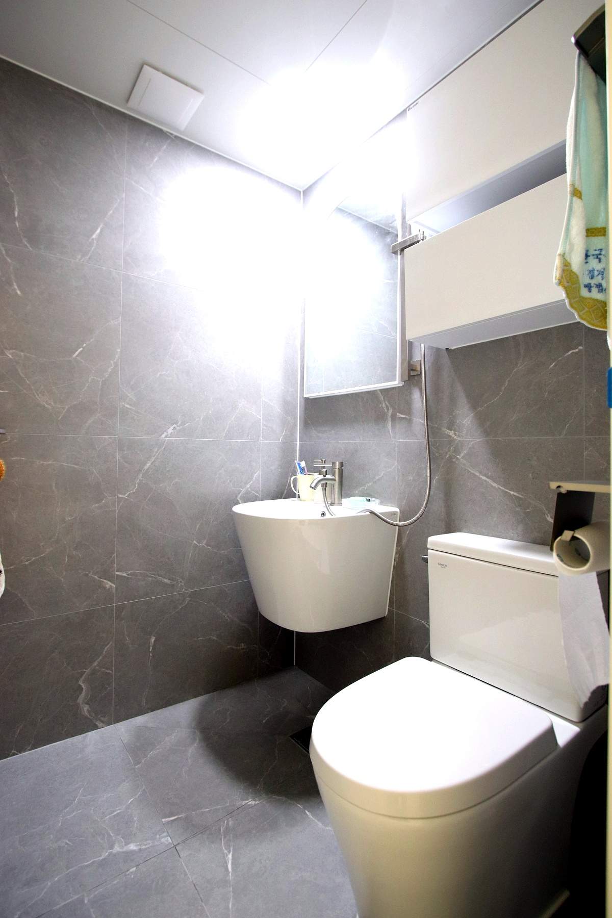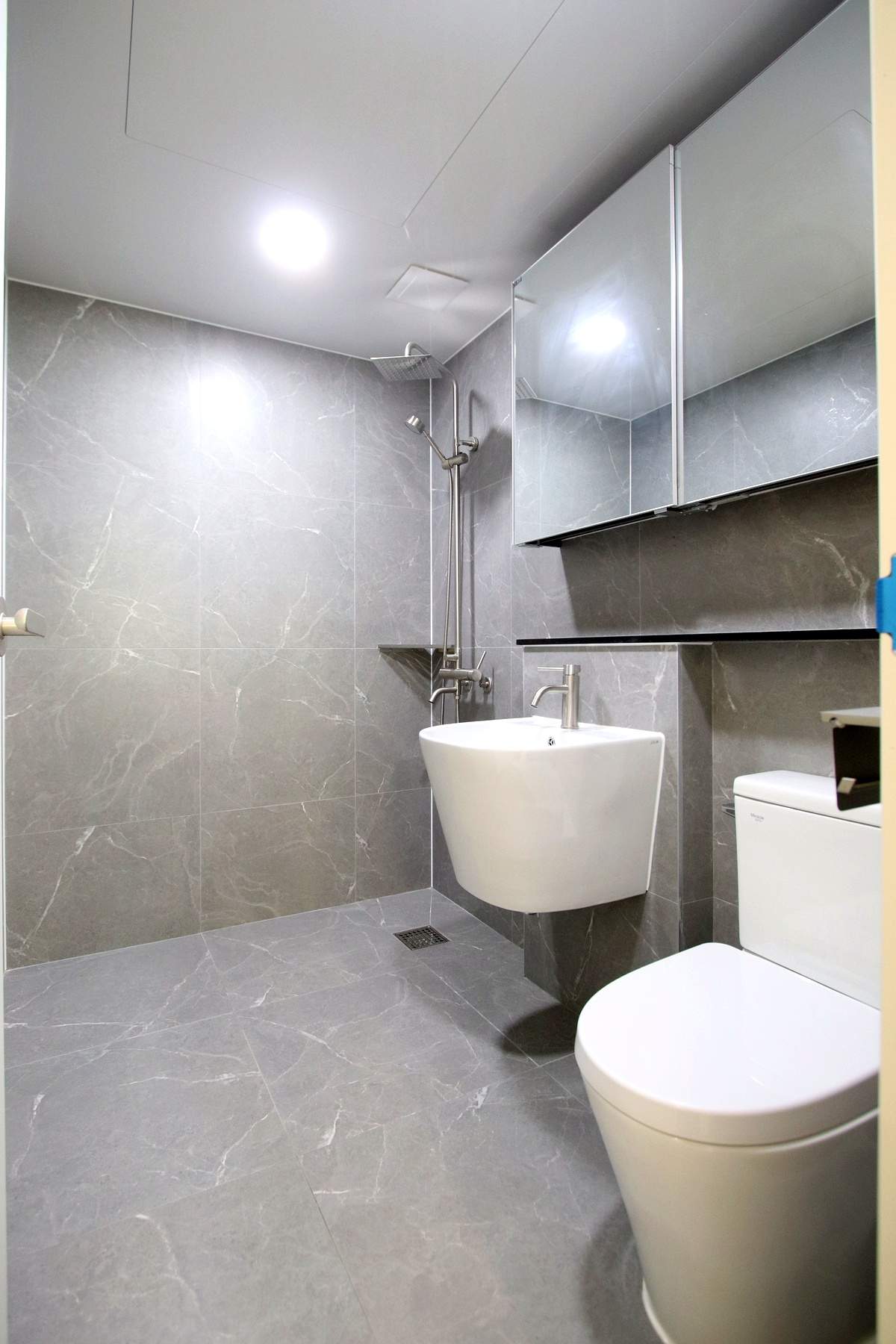 메인 욕실에는 해바라기 샤워기가 설치되어 있어 하루의 피로를 씻어내기에 충분해 보였고 거울 수납장과 젠다이 선반 덕분에 욕실 용품 정리도 깔끔하게 해결될 것 같았습니다.