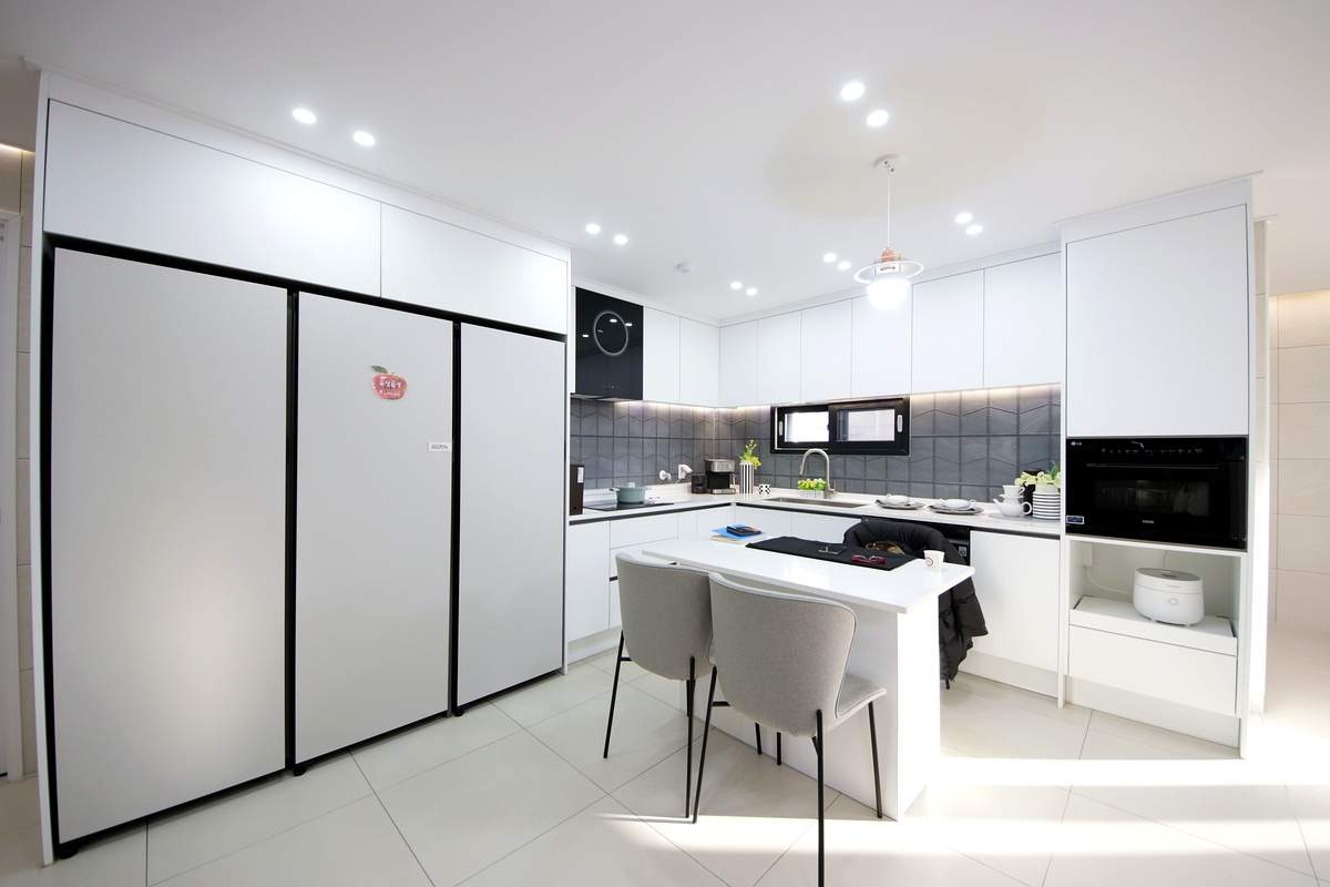 냉장고 자리도 키친핏으로 딱 맞게 설계되어 있어 인테리어의 통일감을 해치지 않고 깔끔하게 배치가 가능합니다.