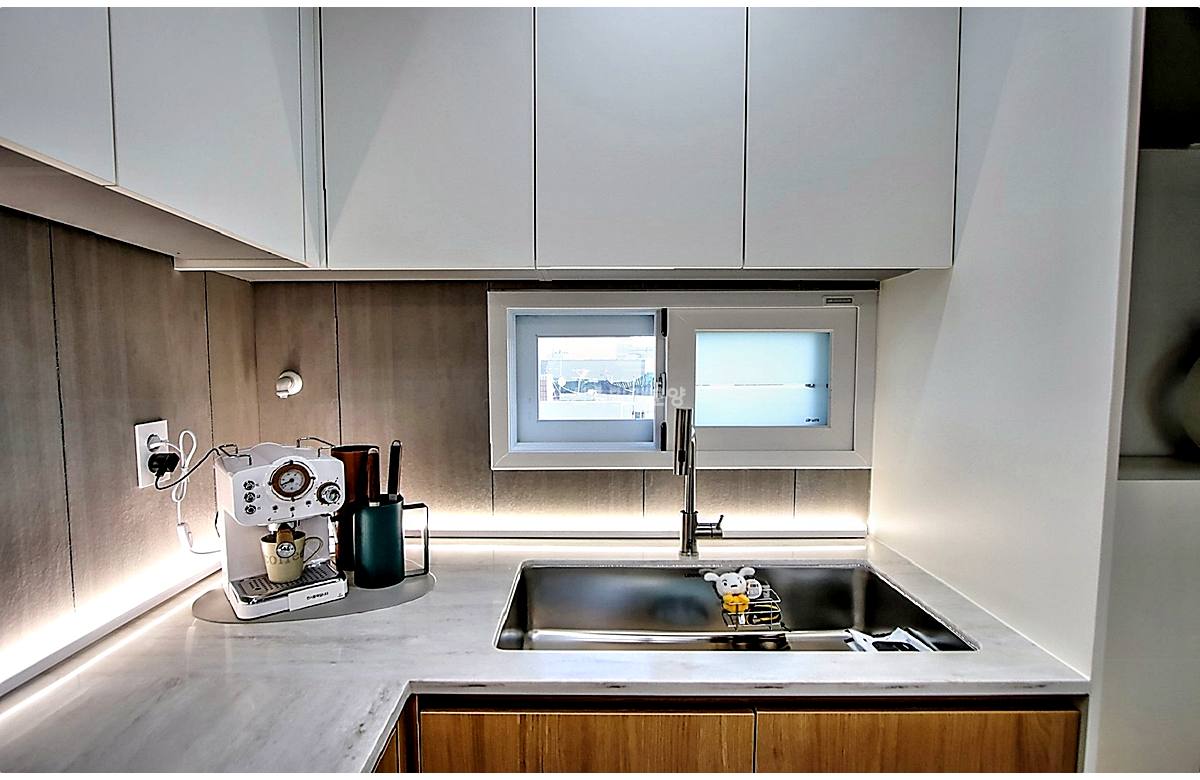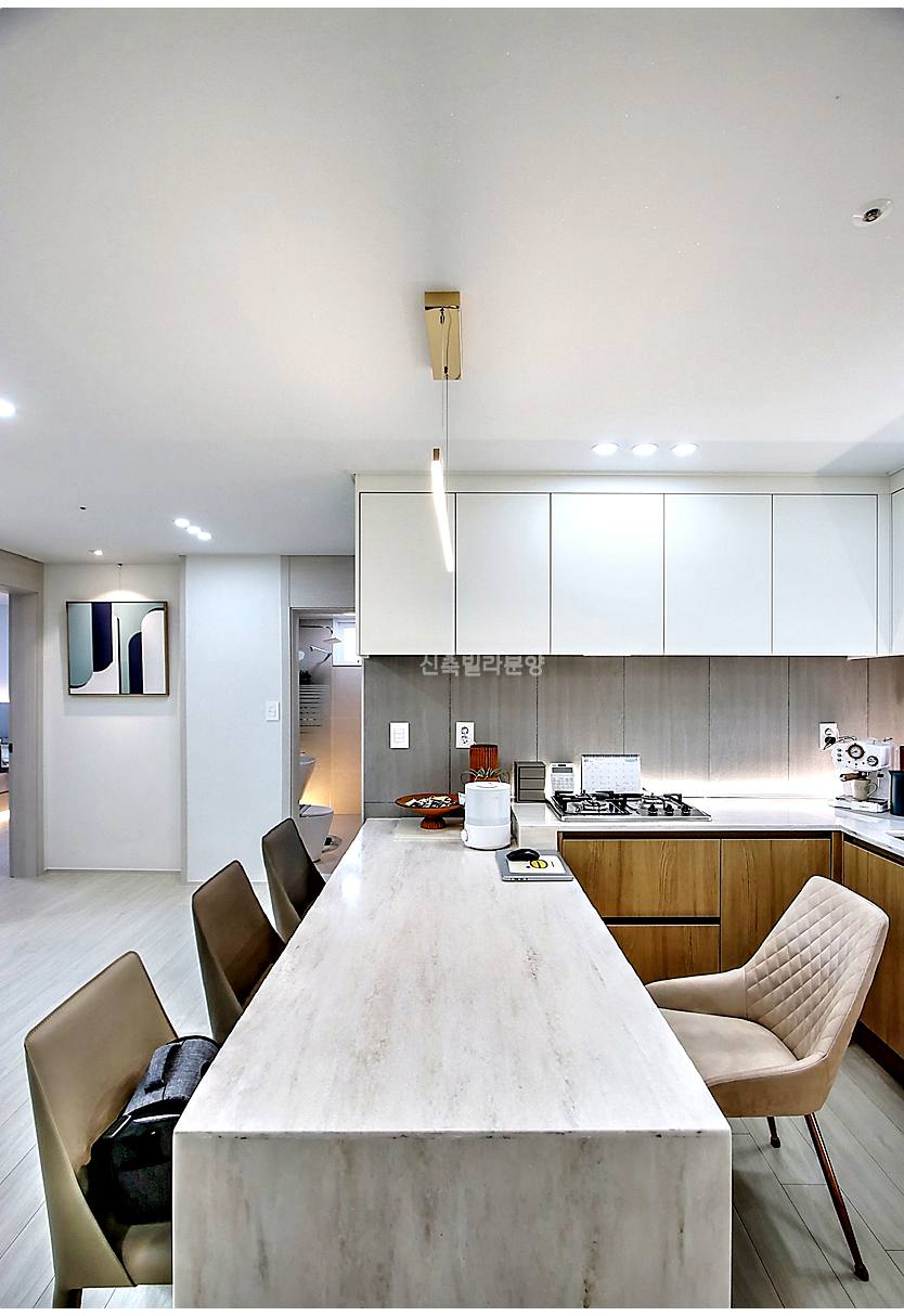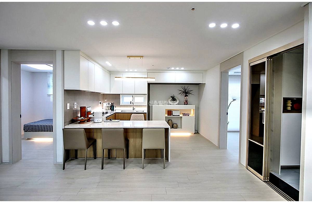 - 주방의 디테일: 아일랜드 식탁과 환기창은 기본, 냉장고 전용 배치장까지 완벽하게 세팅되었어요.