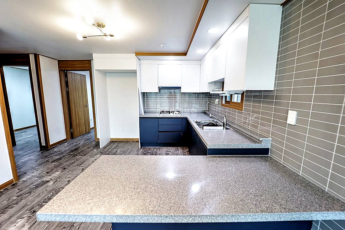 아일랜드 식탁이 포함된 ㄷ자형 싱크대 형태가 동선을 단단히 잡아요.