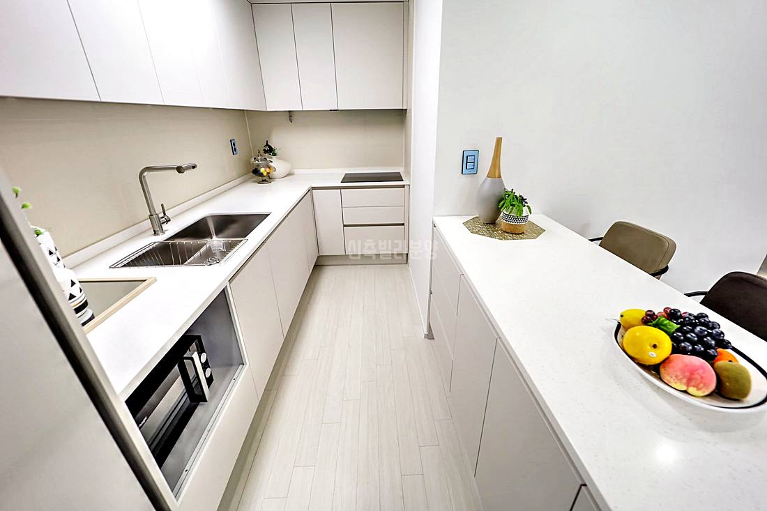 주안동신축빌라 요리 좋아하시는 분이라면 거실과 분리된 구조라 음식 냄새도 따로 관리할 수 있죠. 기본 옵션으로 3 도어 냉장고와 싱크대가 마련되어 있어요. 아일래드 식탁이 앞쪽에 있어 동선이 짧고 편리하답니다.