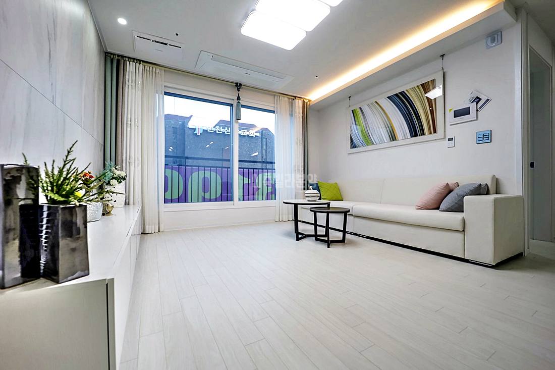 인천신축빌라 문 열자마자 눈에 들어오는 건 넓게 펼쳐진 거실이에요. 4인 소파와 테이블을 두어도 여유롭죠. 천장에 여러 개의 LED 조명과 라인 조명이 있어, 밤에 밝아도 불빛이 균일하답니다. 특히 바닥은 밝은 우드 톤 강마루를 사용해서, 햇살이 들어오면 온도가 따뜻하게 느껴지죠.