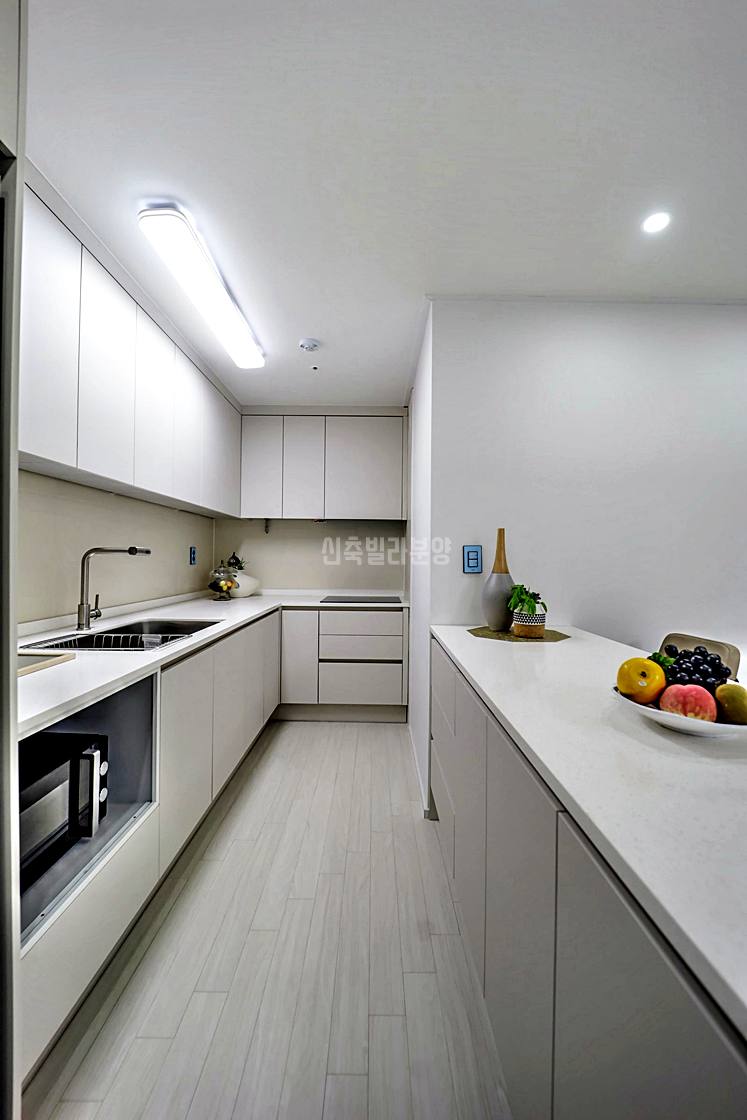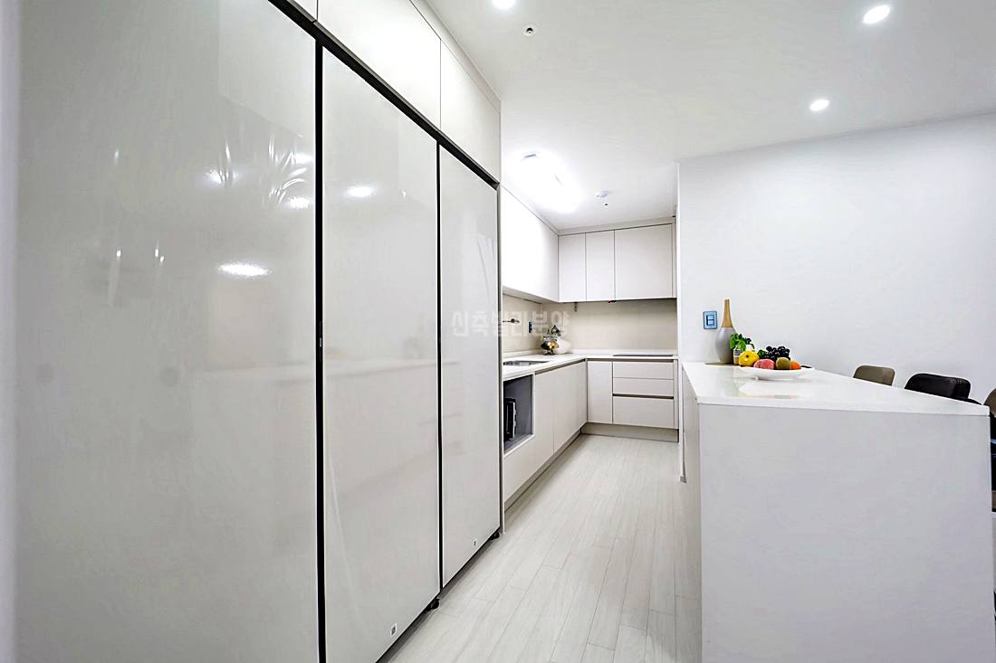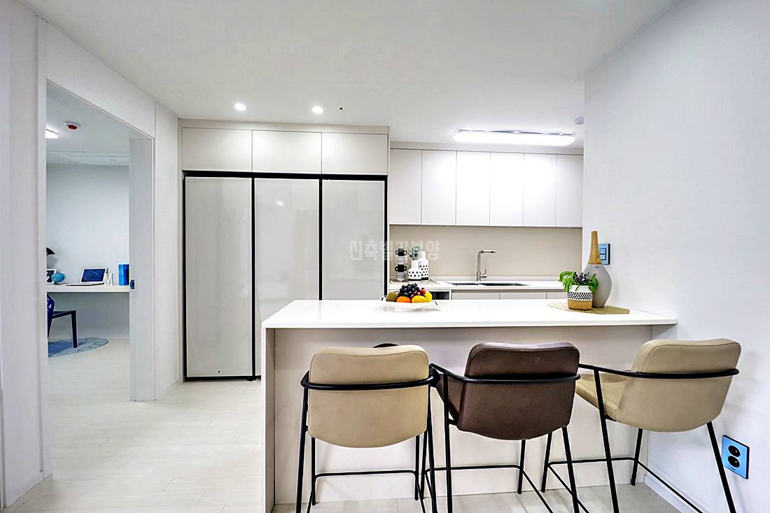 주안동신축빌라 요리 좋아하시는 분이라면 거실과 분리된 구조라 음식 냄새도 따로 관리할 수 있죠. 기본 옵션으로 3 도어 냉장고와 싱크대가 마련되어 있어요. 아일래드 식탁이 앞쪽에 있어 동선이 짧고 편리하답니다.