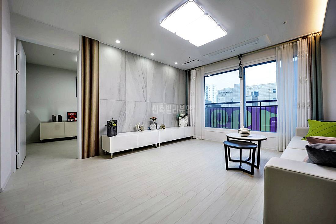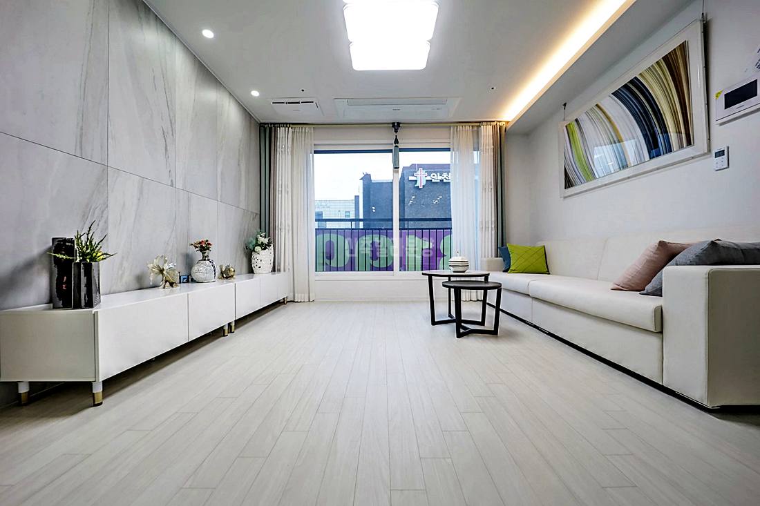 인천신축빌라 문 열자마자 눈에 들어오는 건 넓게 펼쳐진 거실이에요. 4인 소파와 테이블을 두어도 여유롭죠. 천장에 여러 개의 LED 조명과 라인 조명이 있어, 밤에 밝아도 불빛이 균일하답니다. 특히 바닥은 밝은 우드 톤 강마루를 사용해서, 햇살이 들어오면 온도가 따뜻하게 느껴지죠.
