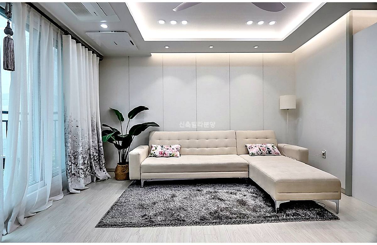 거실 옵션으로 시스템에어컨, 공기순환기, 실링팬까지 설치되어 있어서 여름철 시원하게 보내기 좋을 것 같았어요.