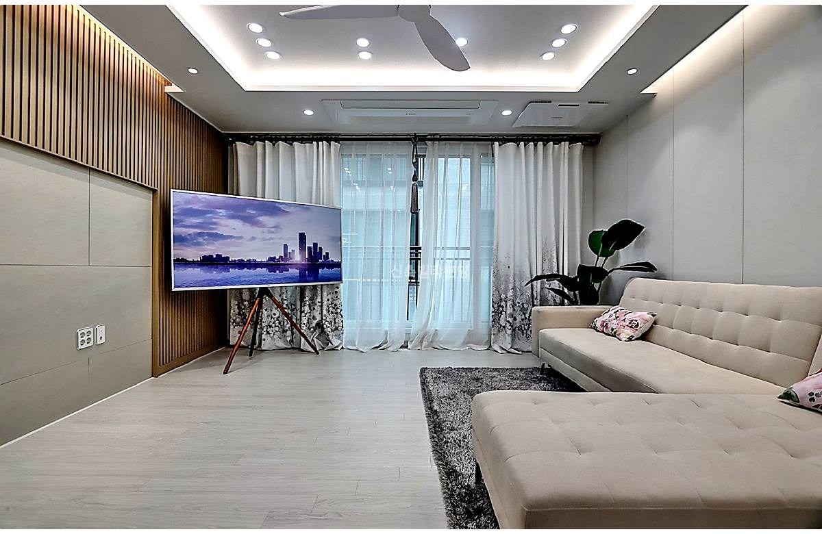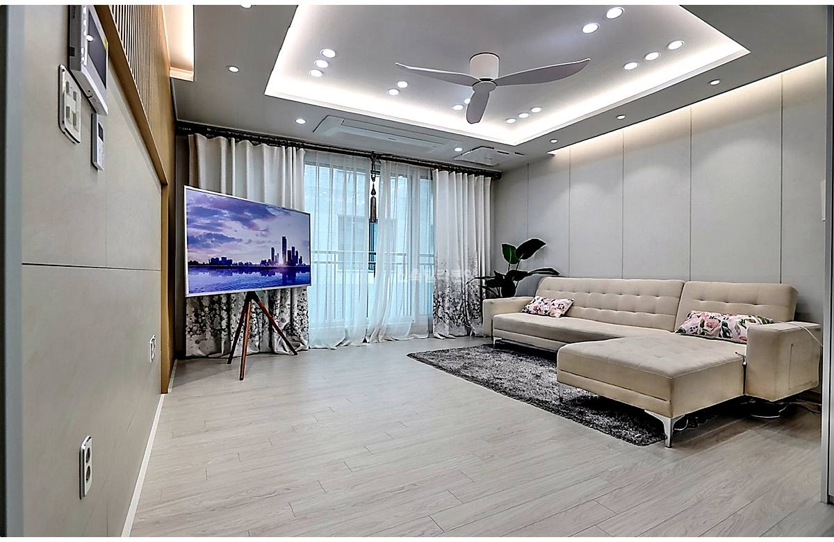 거실 옵션으로 시스템에어컨, 공기순환기, 실링팬까지 설치되어 있어서 여름철 시원하게 보내기 좋을 것 같았어요.