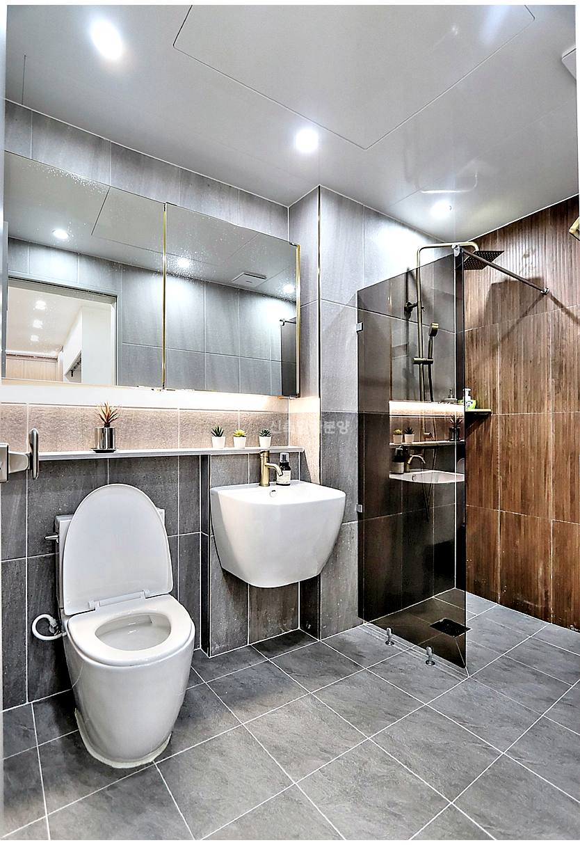 두 욕실 모두 기본 구성은 갖추고 있고, 메인욕실에는 유리파티션 샤워부스와 해바라기 수전이 설치되어 있어요.