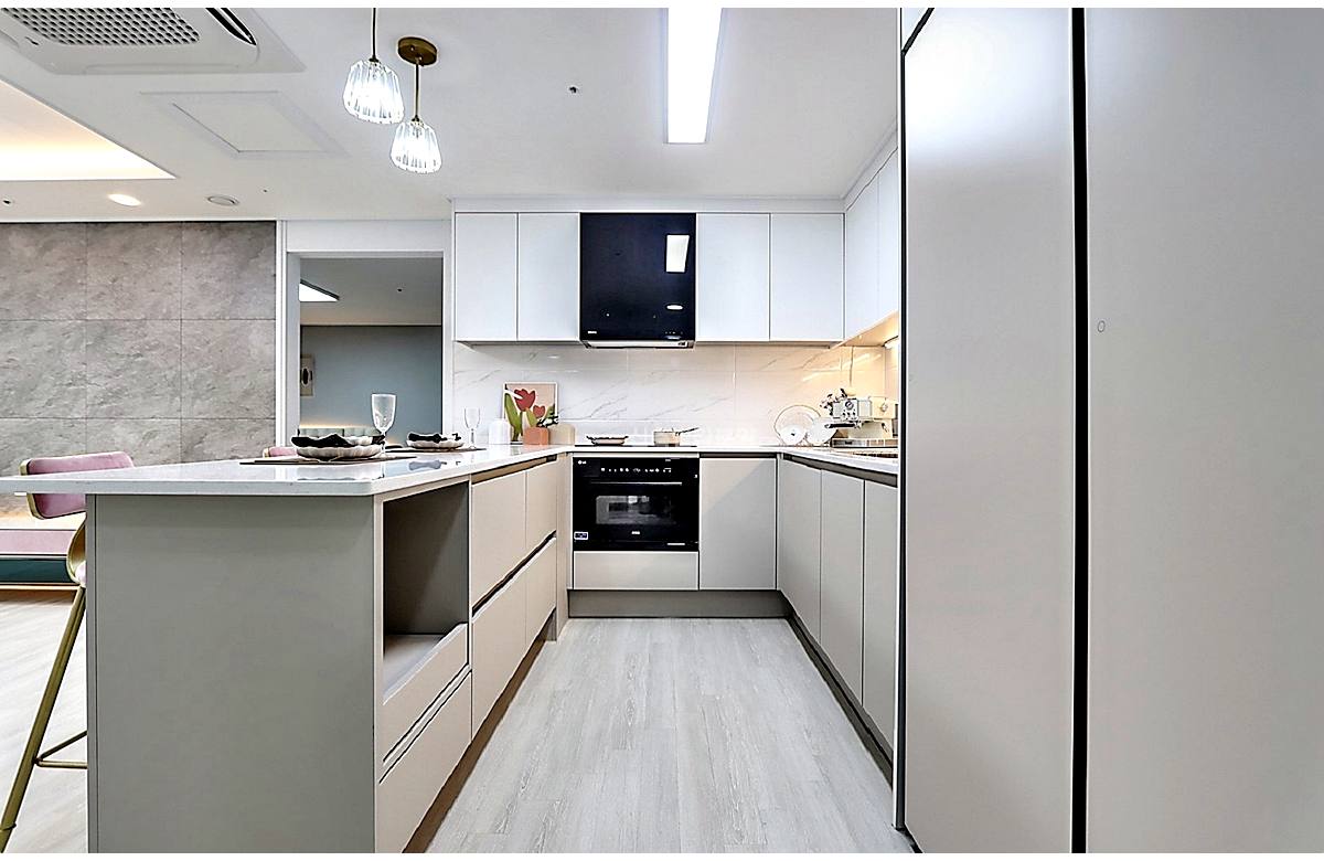 - 🔹 주방: ㄷ자형 아일랜드 식탁 + 대형 팬트리 수납