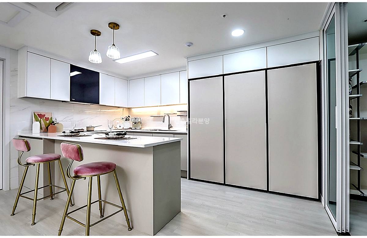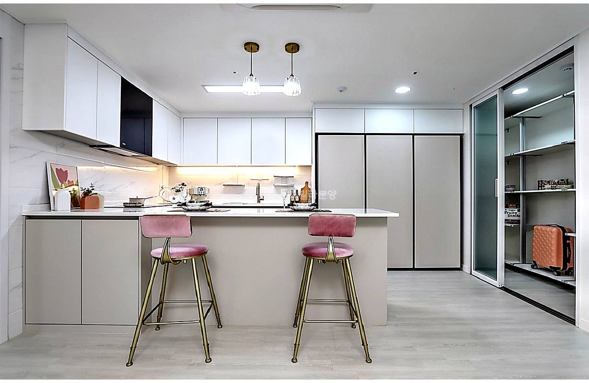 - 🔹 주방: ㄷ자형 아일랜드 식탁 + 대형 팬트리 수납