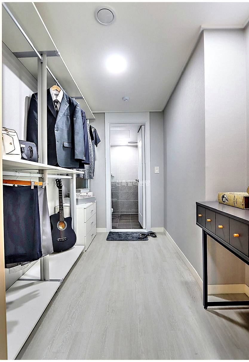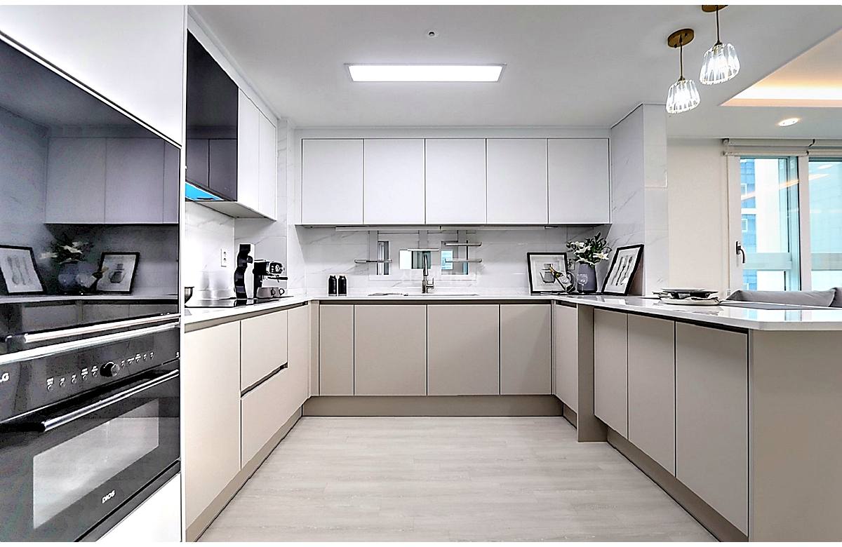 주방은 동선의 효율을 고려한 ㄷ자 구조로 설계되었으며, 대형 팬트리 공간을 확보하여 수납 문제를 근본적으로 해결했습니다. 안방의 드레스룸과 중간방의 발코니 세탁실 등 공간마다 목적에 맞는 명확한 레이아웃이 설정되어 있습니다. 비스포크 냉장고와 광파오븐 등 빌트인 옵션은 추가 가전 구매 비용을 절감시켜 실질적인 분양가 인하 효과를 배가시킵니다.