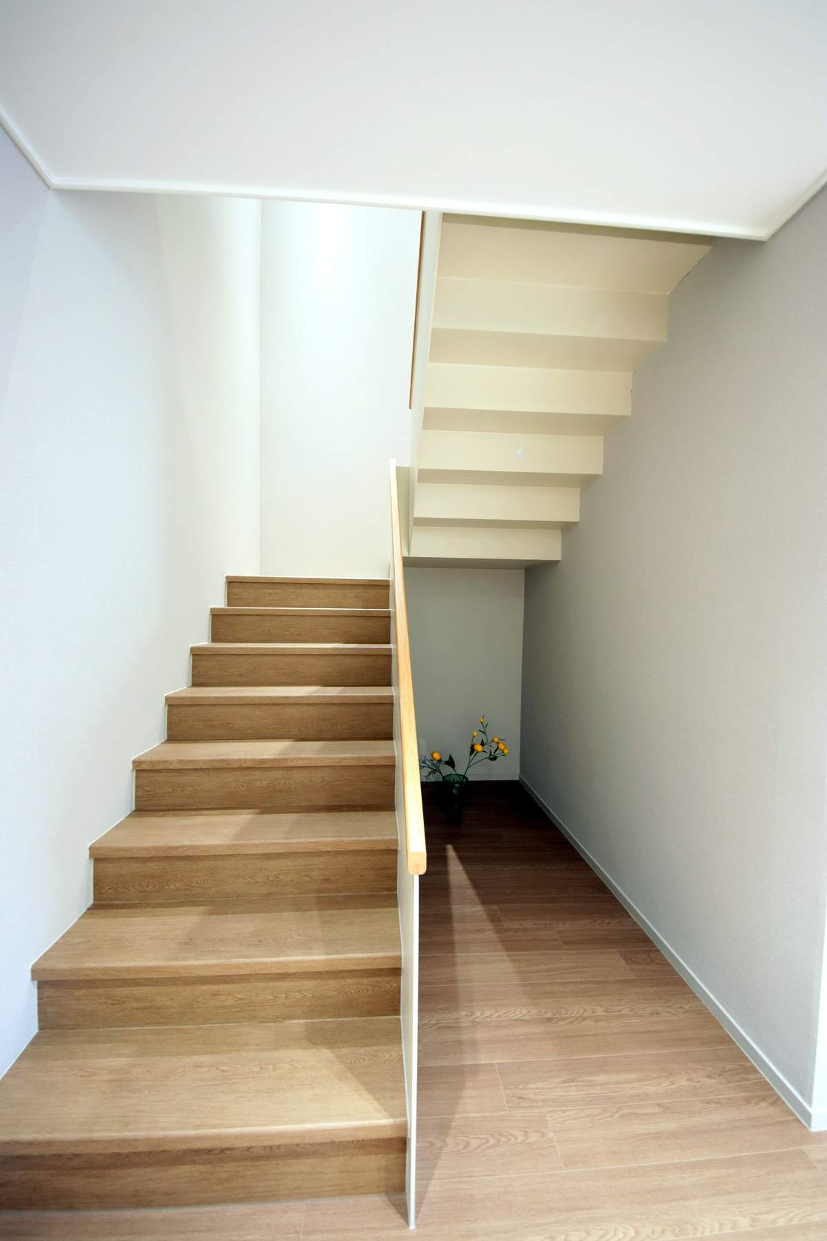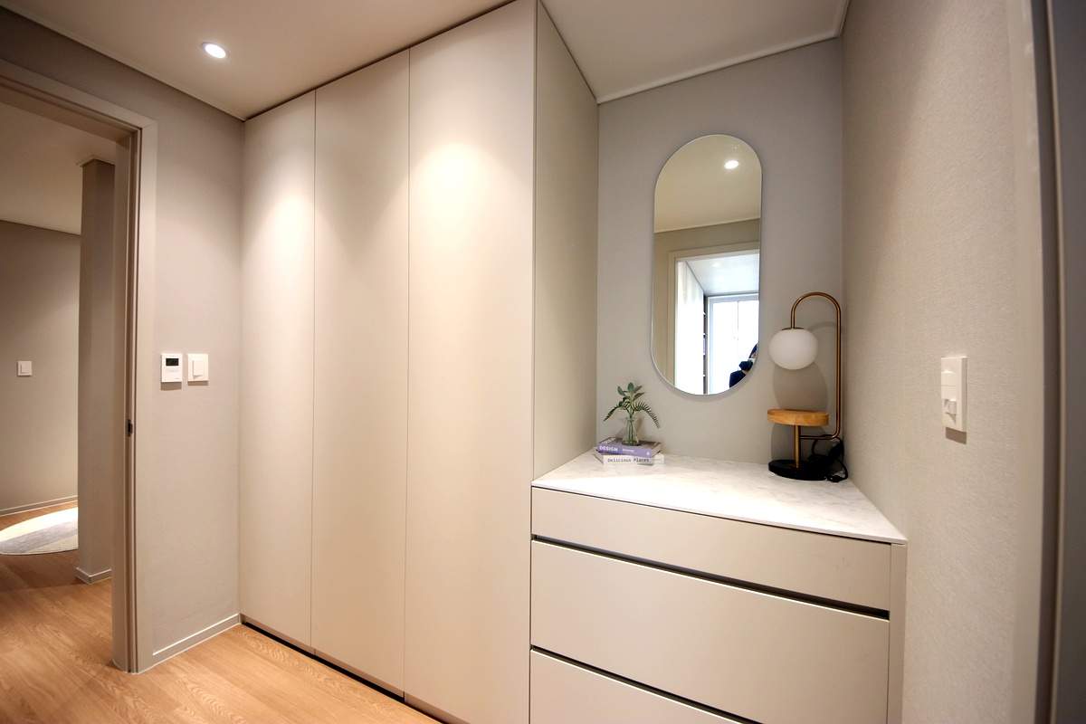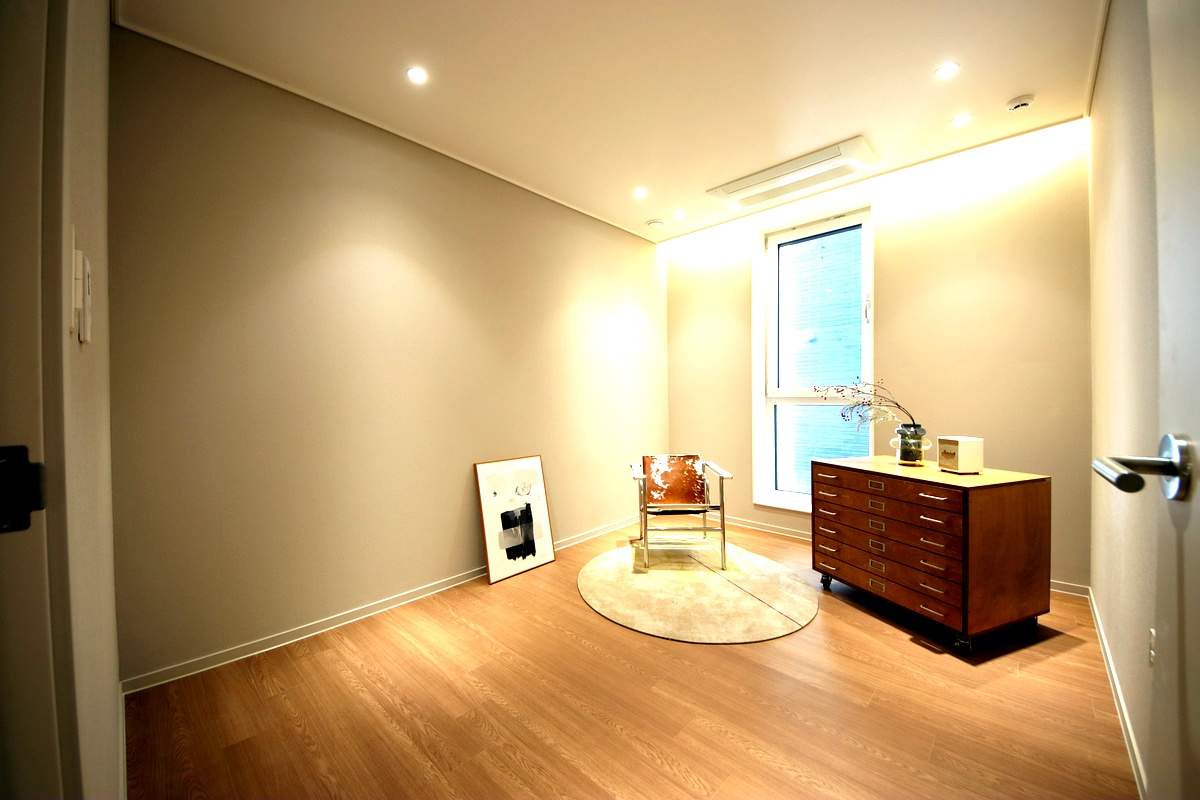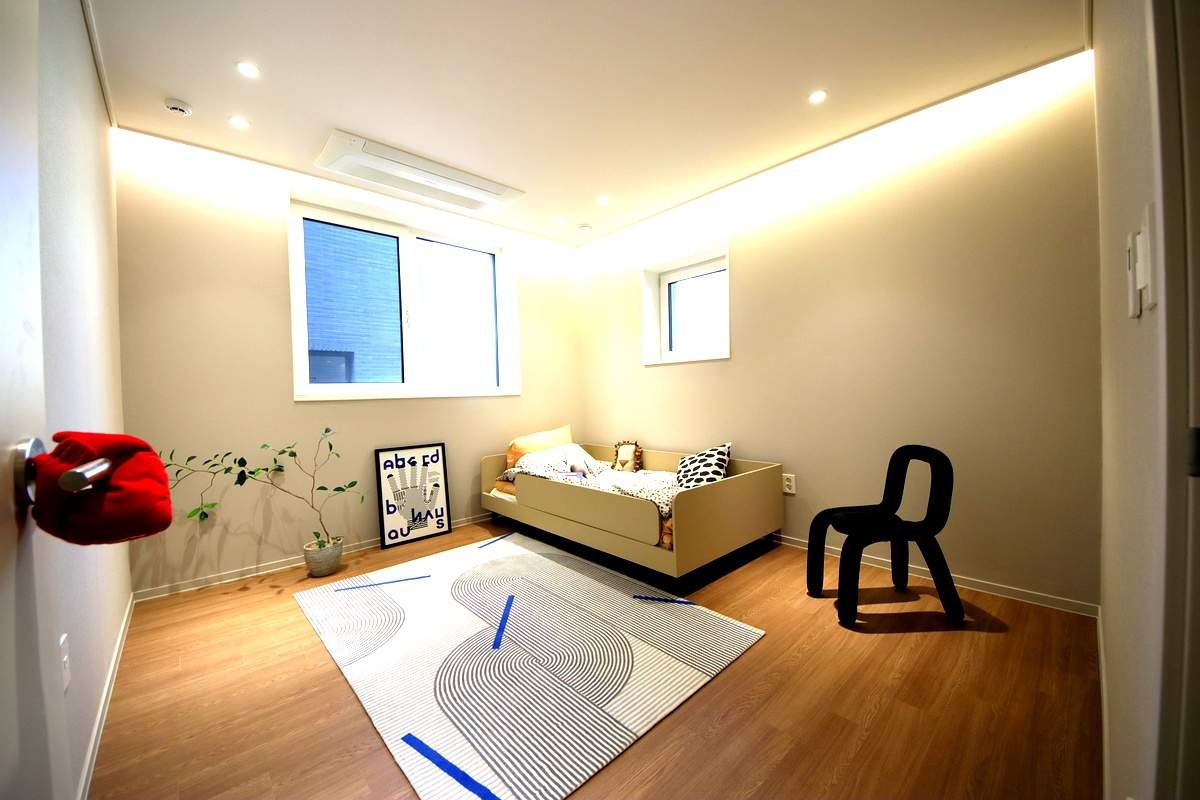 내부 계단을 통해 올라가면 미니 거실과 3개의 방이 나타납니다. 모든 방의 크기가 여유로워 성인 자녀가 쓰기에도 부족함이 없으며, 안방에는 붙박이장과 화장대가 기본 시공되어 가구 구입 부담을 줄였습니다.