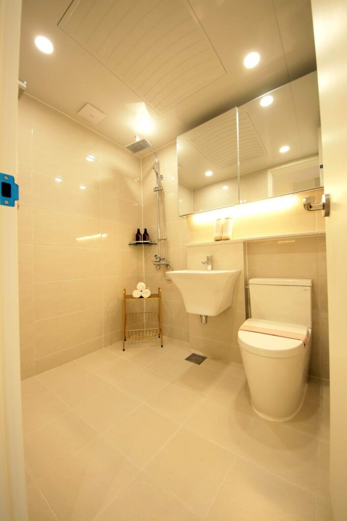 - 메인 욕실: 넓은 공간 + 거울 수납장 + 젠다이 선반